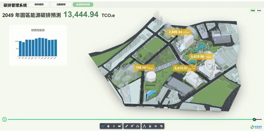 結合數位雙生技術的碳排管理平台,能將實體園區轉化為視覺化模型 。管理者可直觀掌握各棟建築的能耗預測數據,讓永續策略從被動因應升級為精準的前瞻治理。