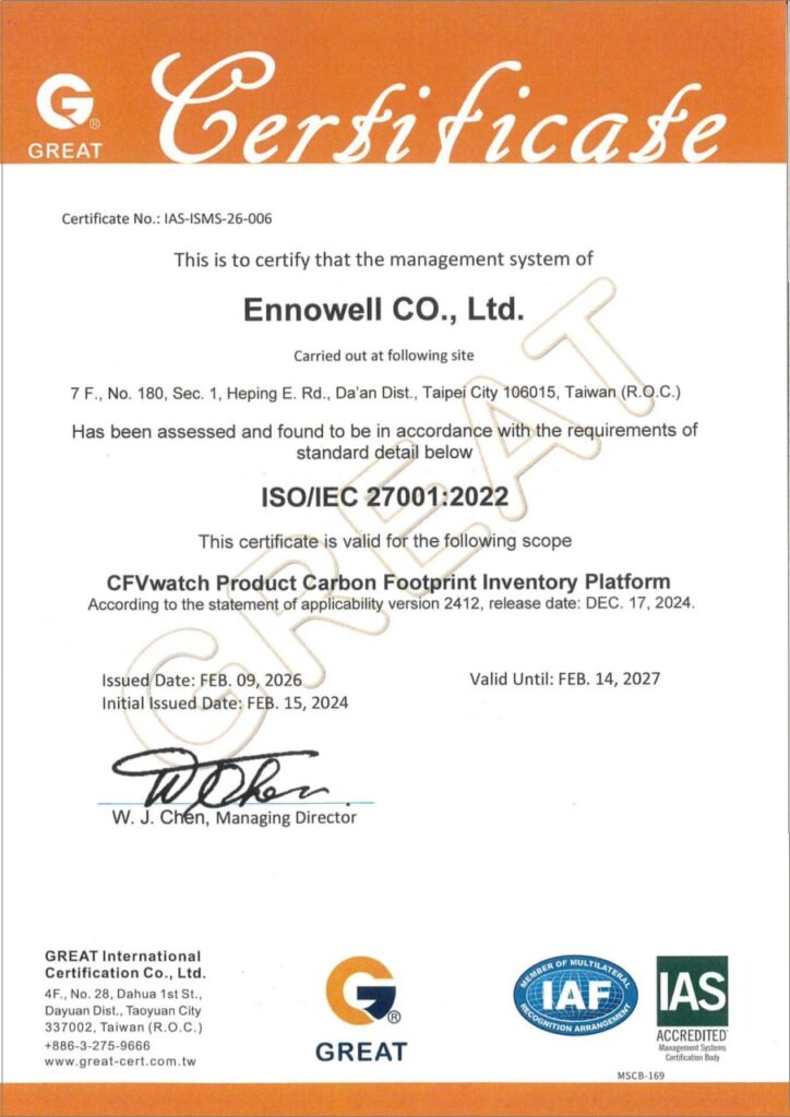 CFVWatch產品碳足跡計算平台,經由格瑞驗證公司審查通過,符合ISO/IEC 27001資訊安全管理系統認證。
